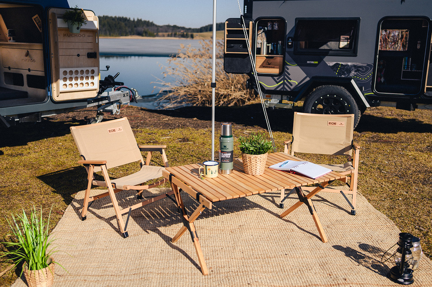2 Stühle + ein Attraktiver Buchenholz-Falttisch der Marke EOE mit Kuckoo Branding. Angenehm und aufrecht sitzen, und das in einem attraktiven Stuhl aus warmem FSC-zertifiziertem Buchenholz. Das bietet dir der Klappstohl im Regiestuhl-Design!